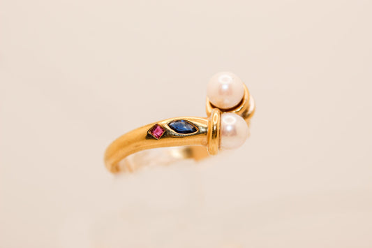 14K Gold Pearl With Ruby Sapphire Emerald And Diamond Ring
