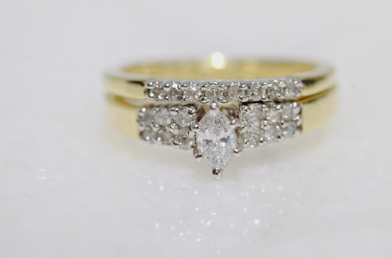 Celebrate your love with unparalleled elegance with this stunning diamond wedding set, featuring a diamond marquise-cut center stone and a matching diamond band, all crafted in radiant 14k gold. The marquise-cut diamond exudes timeless beauty and sophistication, while the surrounding round diamonds add brilliance and sparkle. The matching diamond band complements the engagement ring perfectly, creating a cohesive and harmonious look. Together, these exquisite pieces symbolize the eternal bond of love and commitment. Whether exchanged as symbols of devotion or worn as a dazzling statement of style, this diamond wedding set is sure to captivate hearts and inspire admiration for years to come.