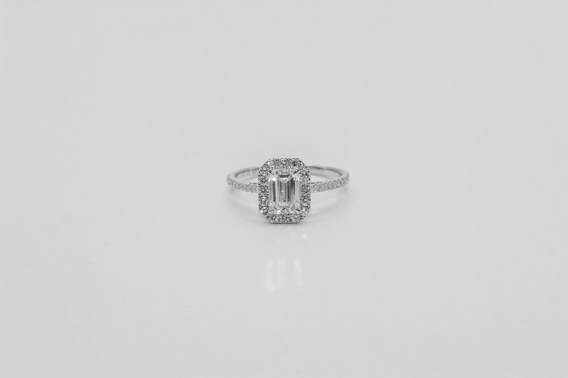 14K White Gold Emerald Cut Halo Diamond Solitaire Ring
