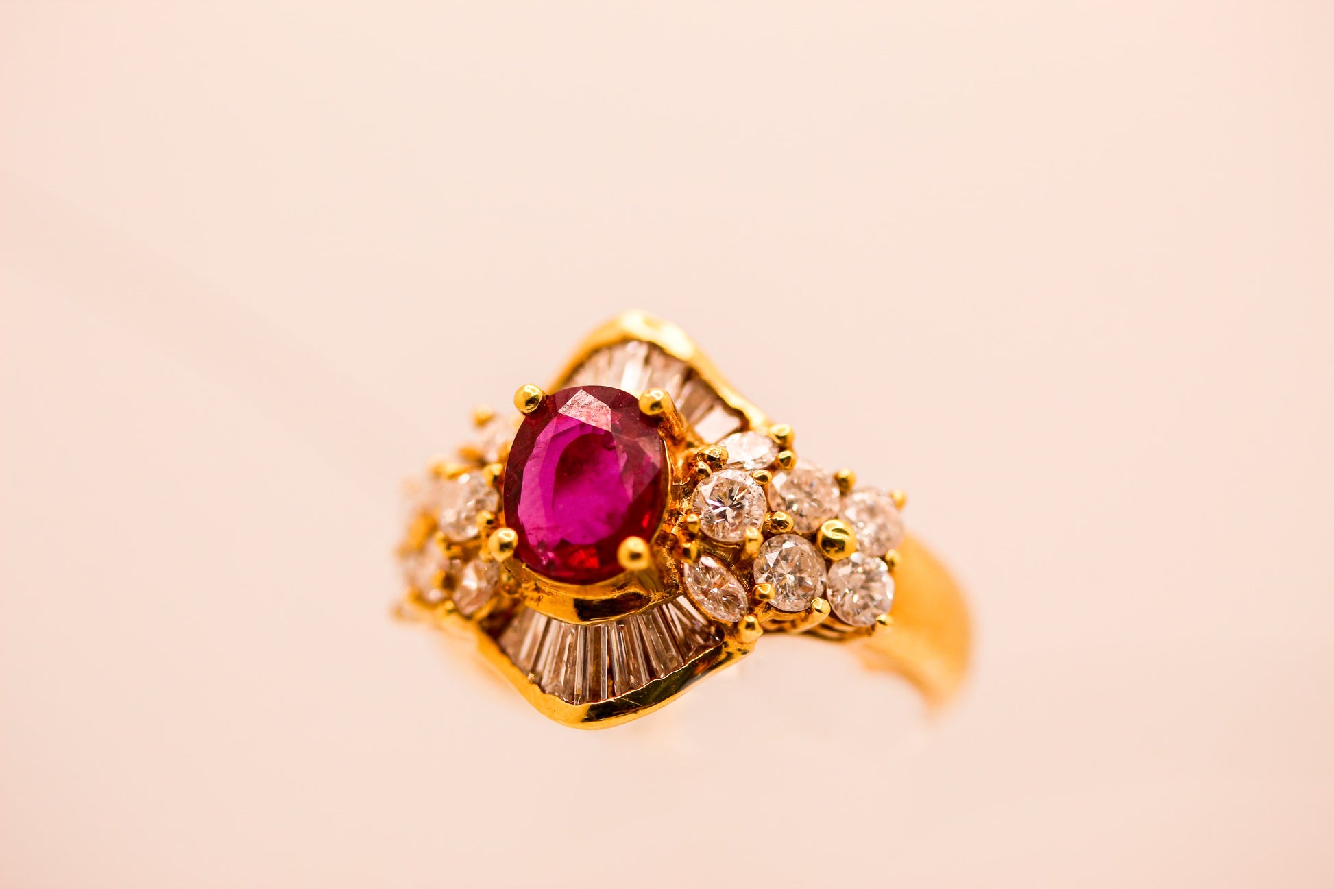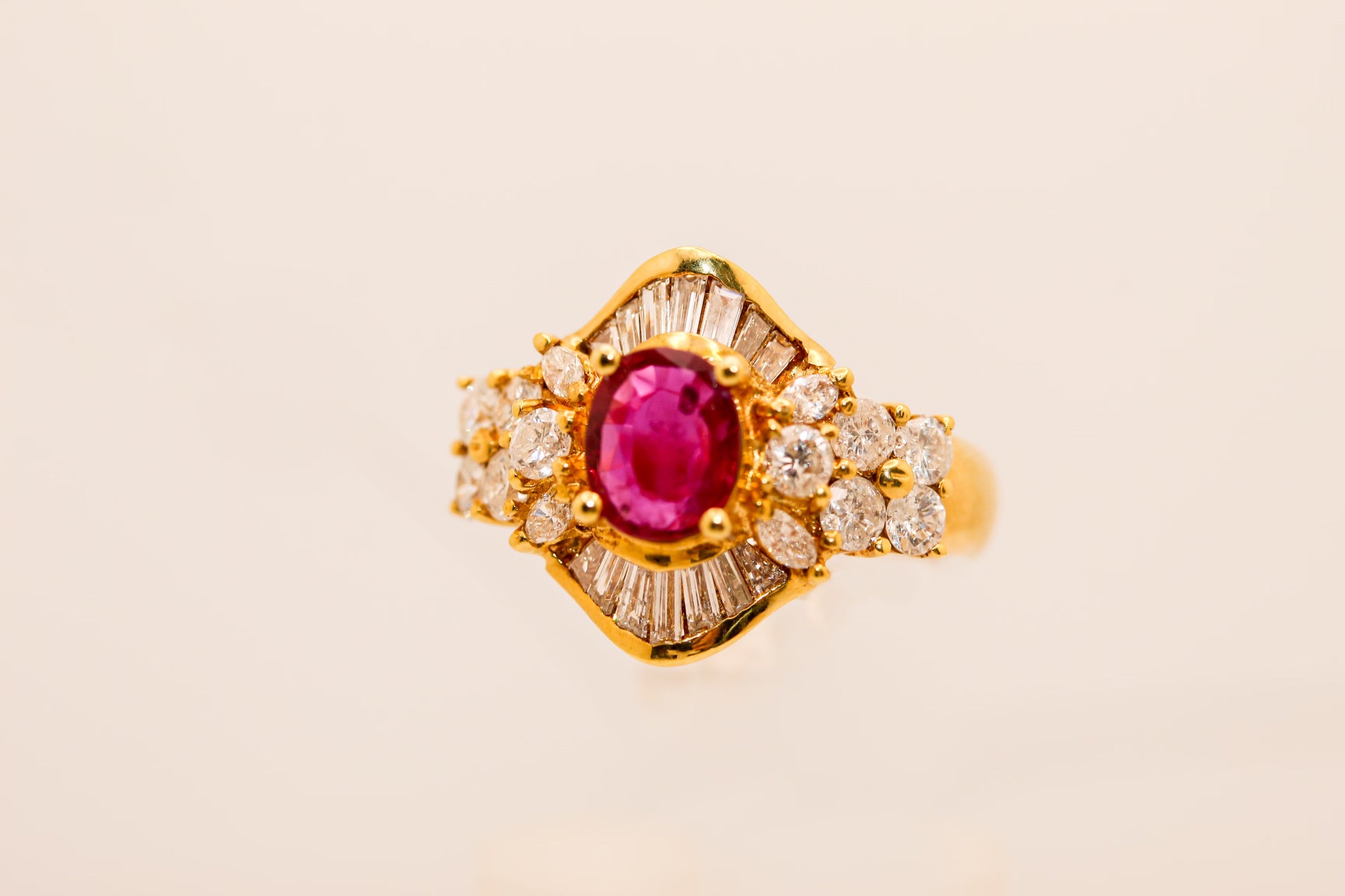 Experience the allure of vintage charm with our Ruby and diamond ring, a timeless masterpiece in 18k gold. Centered around a brilliant 0.79-carat natural Ruby, this ring is adorned with a surround of baguette and round diamonds totaling 1.25 carats. The intricate design captures the essence of refined elegance, making it a statement piece that transcends trends. Adorn your hand with this vintage-inspired ring, a perfect blend of the rich red hue of Ruby and the timeless sparkle of diamonds set in 18k gold.