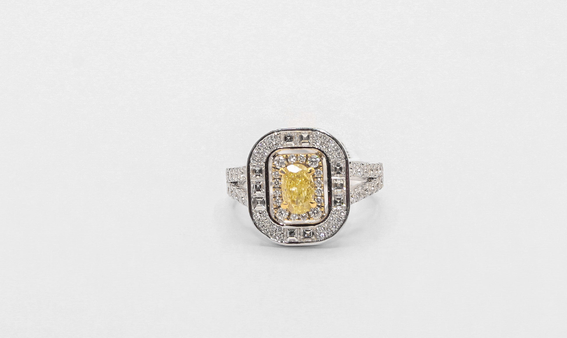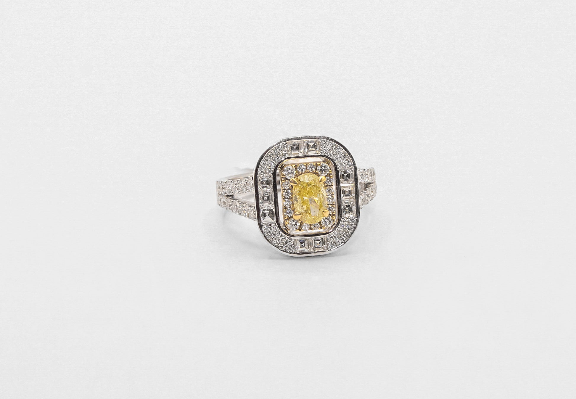 The 18k white gold ring features a striking fancy .53 carat oval yellow diamond set in a halo setting. Surrounding the central stone are dazzling fancy 1.34 carat princess and round cut diamonds, meticulously arranged in an emerald-shaped design, creating a stunning and sophisticated piece of jewelry. Vs quality E color