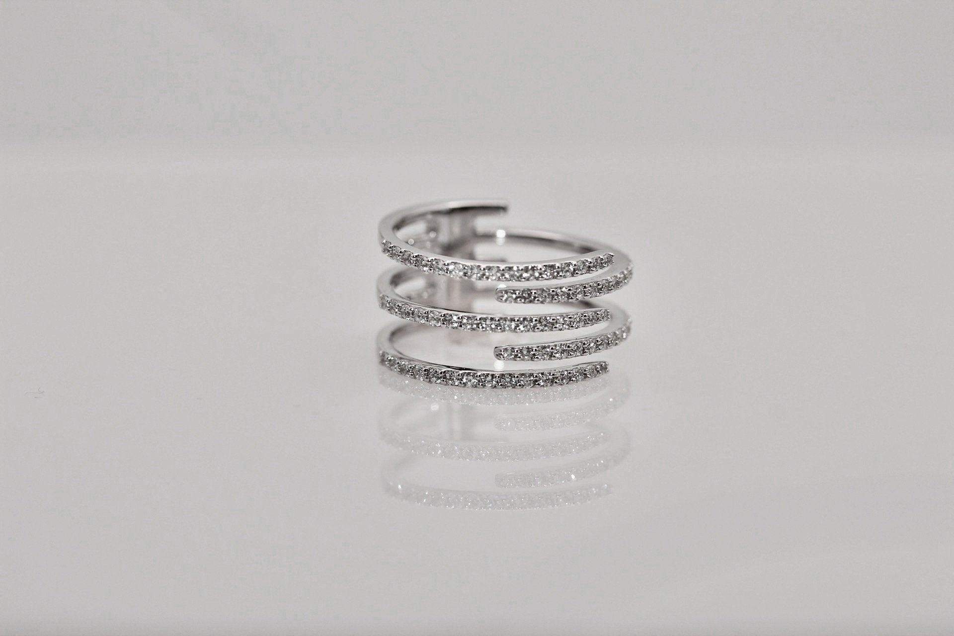 A modern white gold -.57 carat diamond ring typically features a sleek and contemporary design with a white gold band setting. The -.57 carat diamond is likely the centerpiece, showcasing brilliant clarity and sparkle. The white gold setting enhances the diamond's brilliance while providing a sophisticated and elegant look. Design elements may vary, ranging from classic solitaire styles to more intricate designs with additional accent diamonds or unique settings.