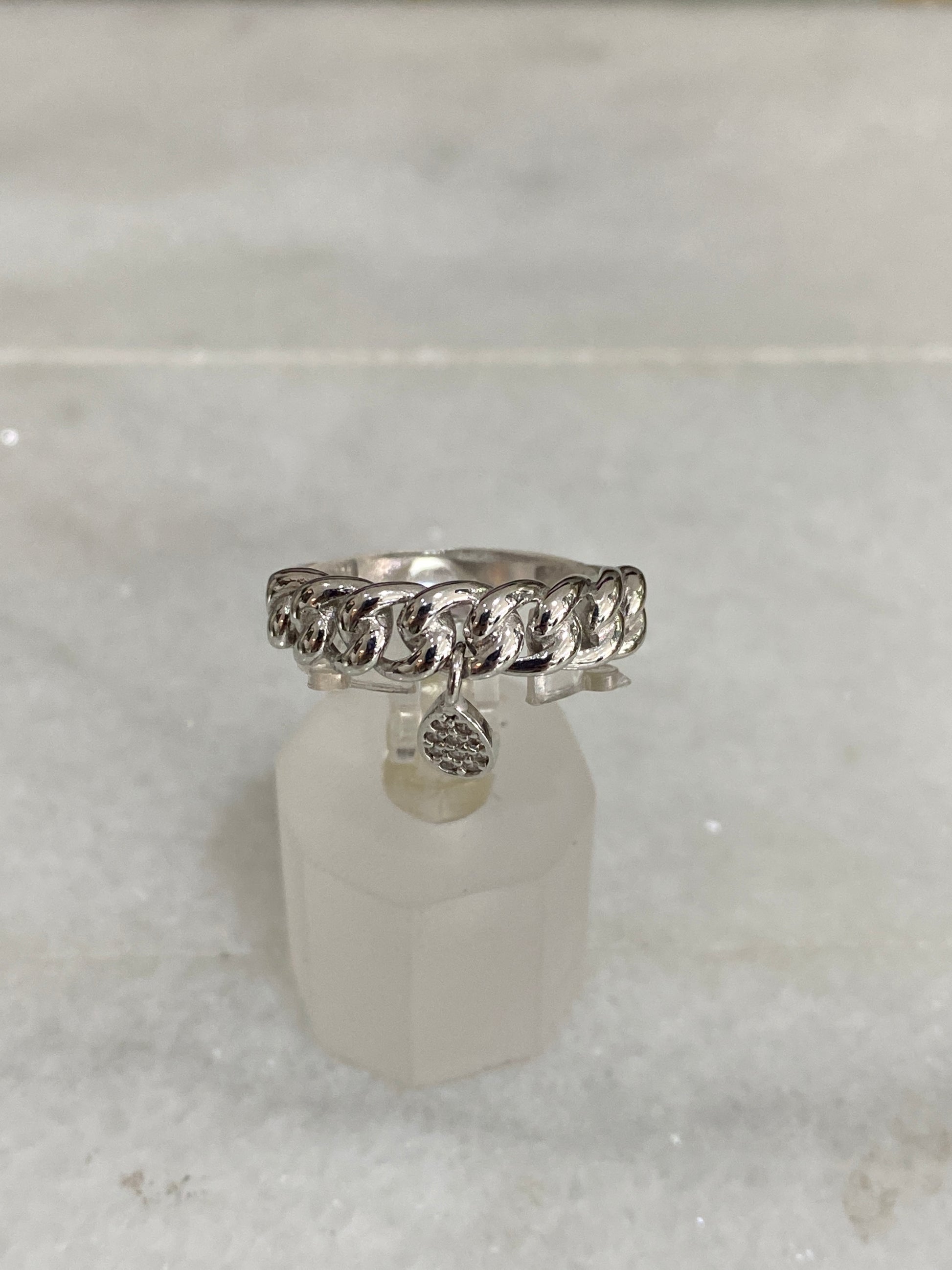 A white gold modern link ring with a crystal dangle is likely a chic and contemporary piece. The modern link design suggests a fashionable and edgy style, while the white gold setting provides a sleek backdrop. The addition of a crystal dangle adds a touch of sparkle and movement, creating an eye-catching and dynamic look. This type of ring is likely to be a trendy accessory, perfect for those who appreciate a combination of modern design and subtle, yet stylish, embellishments.
