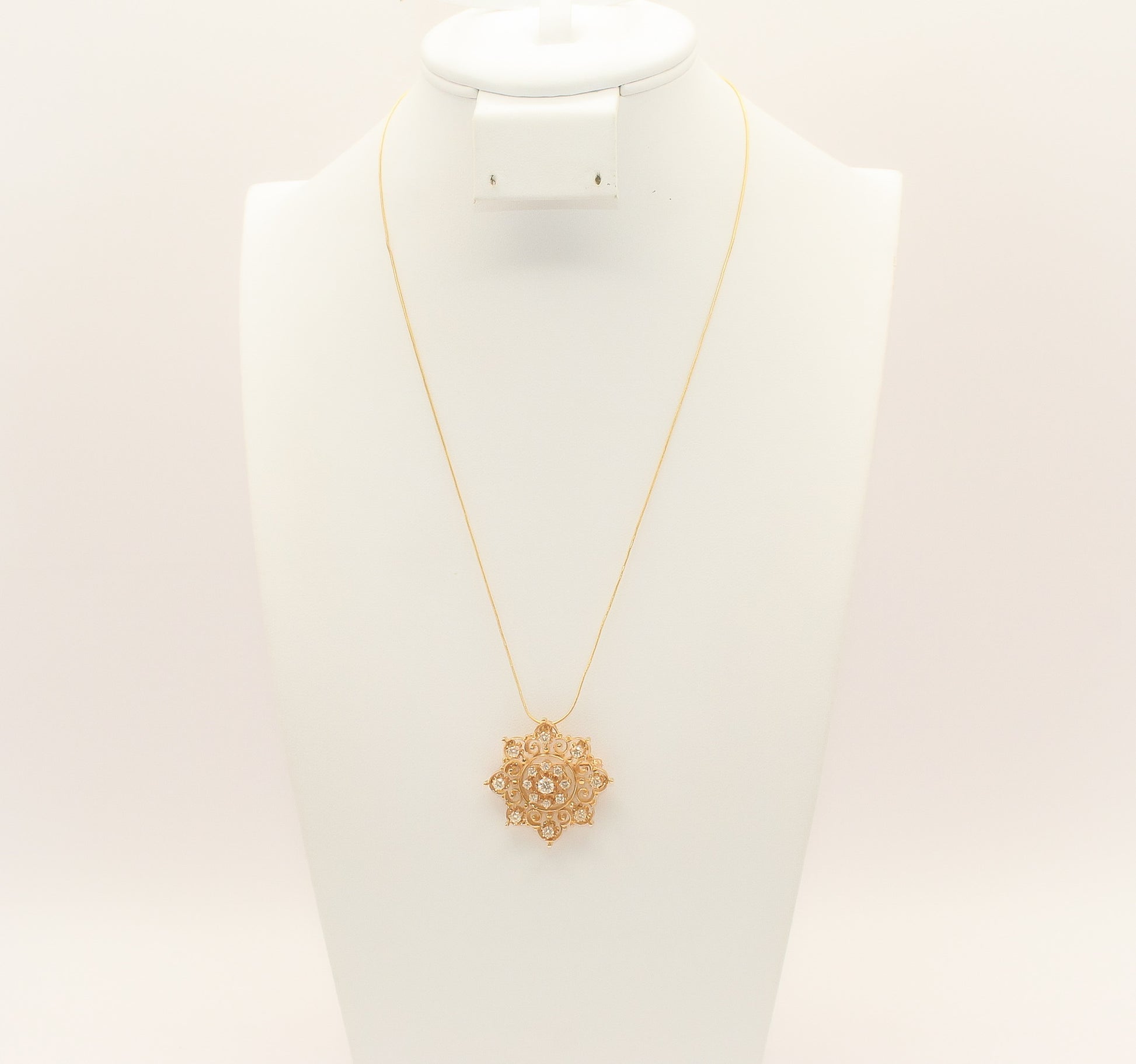 A diamond snowflake-like pendant and brooch set in 14k gold offers a stunning representation of winter’s beauty, capturing the delicate and intricate structure of a snowflake with a touch of elegance and luxury.